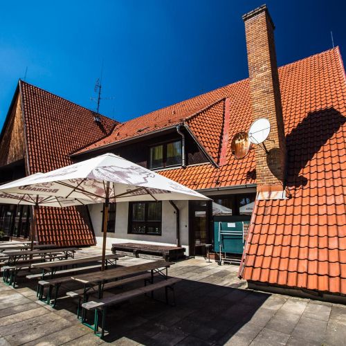 Přímo u jídelny je velká terasa s krbem.